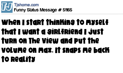 X is When I start thinking to myself that I want a girlfriend I just turn on The View and put the volume on max. It snaps me back to reality