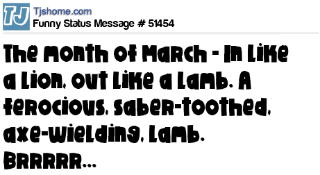 X The month of March - In like a lion, out like a lamb. A ferocious, saber-toothed, axe-wielding, lamb. Brrrrr...