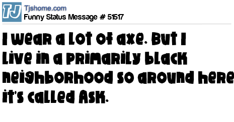 - # 104610 My girlfriend bought me a can of Axe bodyspray for my birthday......However, I live in a predominantly black neighborhood so around here we call is Ask.......