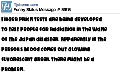 X says Finger prick tests are being developed to test people for radiation in the wake of the Japan disaster. Apparently if the person's blood comes out glowing fluorescent green, there might be a problem.