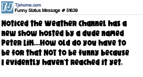 X noticed the Weather Channel has a new show hosted by a dude named Peter Lik....How old do you have to be for that NOT to be funny because I evidently haven't reached it yet.