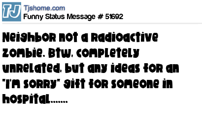 X Neighbor not a radioactive zombie. Btw, completely unrelated, but any ideas for an "I'm sorry" gift for someone in hospital.......