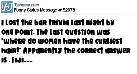 X I lost the bar trivia last night by one point. The last question was "where do women have the curliest hair?" Apparently the correct answer is , Fiji......