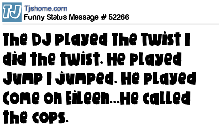 X The DJ played The Twist I did the twist. He played Jump I jumped. He played Come on Eileen...He called the cops.