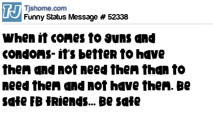 X says When it comes to guns and condoms- it's better to have them and not need them than to need them and not have them. Be safe FB friends... Be safe