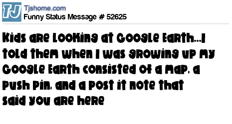 X is Kids are looking at Google Earth...I told them when I was growing up my Google Earth consisted of a map, a push pin, and a post it note that said you are here