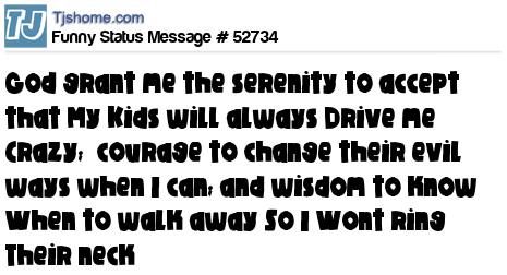 X says God grant me the serenity to accept that My Kids will always Drive me Crazy; courage to change their evil ways when I can; and wisdom to know When to walk away So I Wont ring Their neck