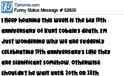 X  I keep hearing this week is the big 17th anniversary of Kurt Cobain's death. I'm just wondering why we are suddenly celebrating 17th anniversary's like they are significant somehow. Otherwise, shouldn't he wait until 20th or 25th like other dead people?