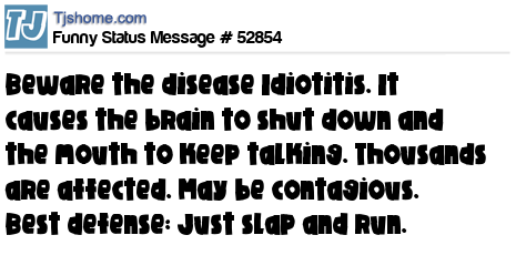 X Beware the disease Idiotitis. It causes the brain to shut down and the mouth to keep talking. Thousands are affected. May be contagious. Best defense: Just slap and run.