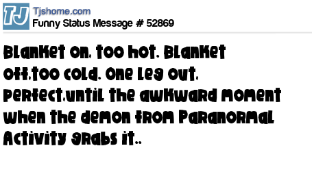 - # 118663 too hot* blanket off *too cold* Put blanket on *too hot again* Stick on foot out…..perfect. *hears creepy noise* Sticks foot back in