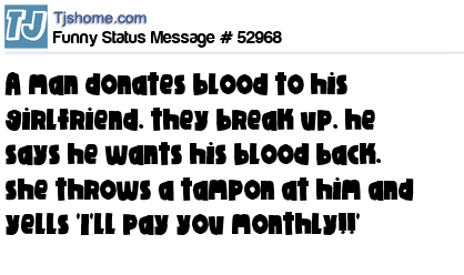 X says a man donates blood to his girlfriend. they break up. he says he wants his blood back. she throws a tampon at him and yells 'I'll pay you monthly!!'