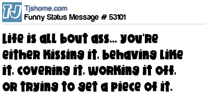 - # 24188 Life is all about ass; you're either covering it, laughing it off, kicking it, kissing it, busting it, trying to get a piece of it, or behaving like one.