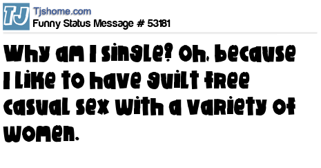 X Why am I single? Oh, because I like to have guilt free casual sex with a variety of women.