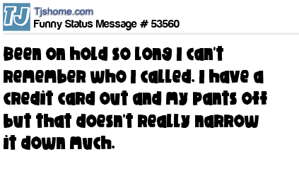 X Been on hold so long I can't remember who I called. I have a credit card out and my pants off but that doesn't really narrow it down much.