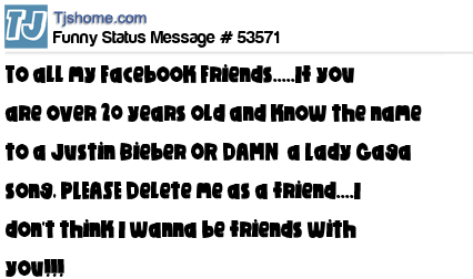 - # 28365 To all my Facebook Friends.....If you are over 20 years old and know the name to a Justin Bieber OR a Lady Gaga song, PLEASE Delete me as a friend....I don't think I wanna be friends with you!!!