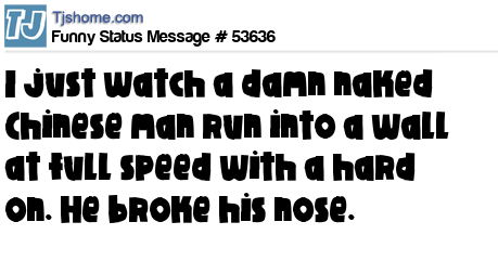 - # 24144 I just watch a naked Chinese man run into a wall at full speed with a hard on. He broke his nose.