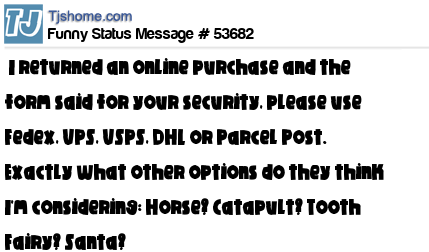 X I returned an online purchase and the form said for your security, please use Fedex, UPS, USPS, DHL or Parcel Post. Exactly what other options do they think I'm considering: Horse? Catapult? Tooth Fairy? Santa?