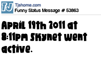 - # 53921 Be nice to your laptop/smartphone today. SkyNet was supposed to become self-aware last night, April 19th 2011. If all goes well we can avoid Judgement Day tomorrow.