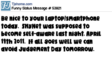 X is Be nice to your laptop/smartphone today. SkyNet was supposed to become self-aware last night, April 19th 2011. If all goes well we can avoid Judgement Day tomorrow.