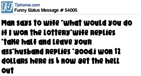 X man says to wife "what would you do if I won the lottery"wife replies "take half and leave your ass"husband replies "good,i won 12 dollars here is 6 now get the hell out