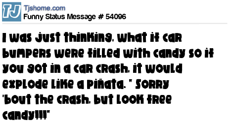 X I was just thinking, what if car bumpers were filled with candy so if you got in a car crash, it would explode like a piñata. " Sorry 'bout the crash, but look free candy!!!"