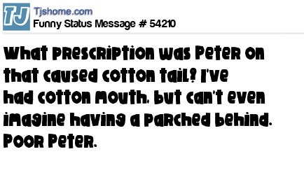 X What prescription was Peter on that caused cotton tail? I've had cotton mouth, but can't even imagine having a parched behind. Poor Peter.