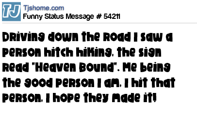 - # 161694 I was driving Home when I saw a Hitch Hiker holding a sign that said, "Heaven Bound." .......... Me being the Good Samaritan that I am, drove completely out of my way ......... To hit Him ......... I'm glad I could help him On his Way.