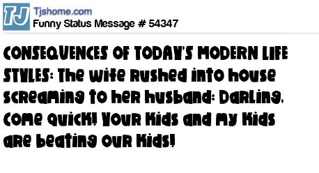 - # 20264 Consequences of American life style: The wife rushed into house screaming to her husband: Darling, Come quick! Ur kids n my kids r beating our kids.