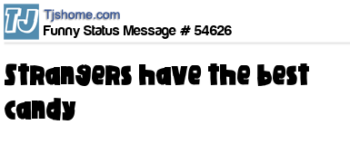 - # 153402 Okay kids don't ever talk to strangers or take candy from strangers or go to stranger's houses except on the day we worship the devil.