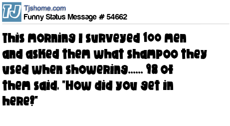 - # 46224 This morning I surveyed 100 women and asked them what shampoo they used when showering... 98 of them said, "How did you get in here?"