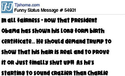 X is In all fairness - now that President Obama has shown his long form birth certificate... He should demand Trump to show that his hair is real and to prove it or just finally shut up!! As he's starting to sound crazier than Charlie Sheen!! Winning