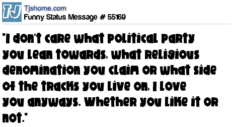 X "I don't care what political party you lean towards, what religious denomination you claim or what side of the tracks you live on, I love you anyways. Whether you like it or not."