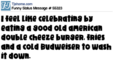 X says I feel like celebrating by eating a good old american double cheeze burger, fries and a cold Budweiser to wash it down.
