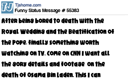 X After being bored to death with the Royal Wedding and the Beatification of the Pope, finally something worth watching on TV. Come on CNN I want all the gory details and footage on the death of Osama Bin Laden. This I can watch for days.