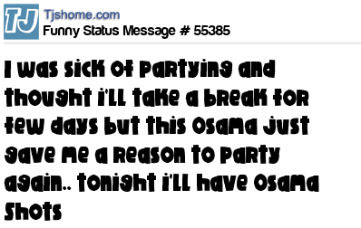 X is i was sick of partying and thought i'll take a break for few days but this Osama just gave me a reason to party again.. tonight i'll have Osama Shots