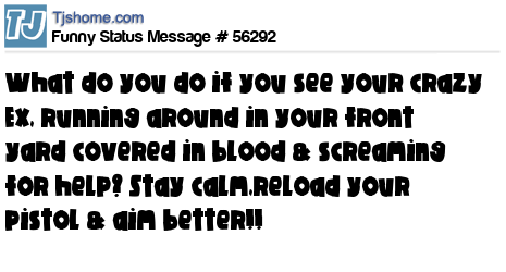 X is What do you do if you see your crazy Ex, running around in your front yard covered in blood & screaming for help? Stay calm,reload your pistol & aim better!!