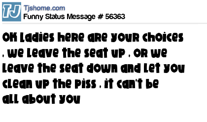 - # 109230 Ladies: Yes, peeing standing up is more difficult than peeing sitting down. Maybe YOU can learn to work the toilet seat. You're a big girl. If it's up, put it down. We need it up. You need it down. You don't hear us complaining when you leave it dow