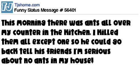 X is this morning there was ants all over my counter in the kitchen, I killed them all except one so he could go back tell his friends I'm serious about no ants in my house!