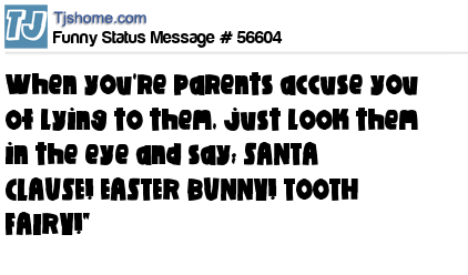 - # 79694 If your parents ever call you a liar, just say "Tooth Fairy, Easter Bunny and Santa". Then walk away like a BOSS!