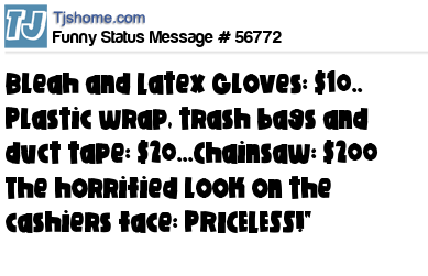 - # 47647 3 bottles of bleach: $15.00. One rope, 3 rolls of duct tape, and a shovel: $35.00. 3 boxes of trash bags: $10.00. The look on the cashier's face: Priceless!