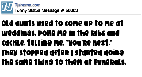 - # 9535 hated it when old aunts used to come up to her at weddings, poke her in the ribs and cackle, "You're next." They stopped after I started doing the same thing to them at funerals.