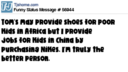 X Tom's may provide shoes for poor kids in Africa but I provide jobs for kids in China by purchasing Nikes. I'm truly the better person.