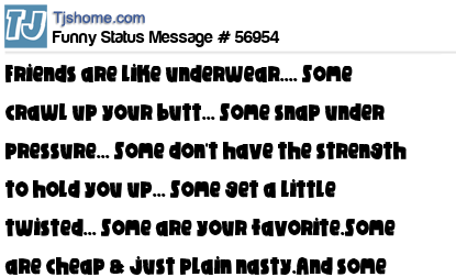 X is Friends are like underwear.... Some crawl up your butt... Some snap under pressure... Some don't have the strength to hold you up... Some get a little twisted... Some are your favorite.Some are cheap & just plain nasty.And some actually do cover your butt