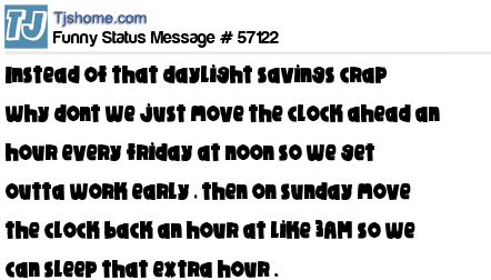 X is instead of that daylight savings crap why dont we just move the clock ahead an hour every friday at noon so we get outta work early , then on sunday move the clock back an hour at like 3AM so we can sleep that extra hour .