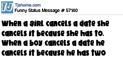 - # 60477 When a girl cancels a date she cancels it because she has to. When a guy cancels a date he cancels it because he has two.