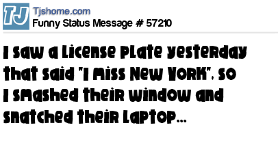 X I saw a license plate yesterday that said "I miss New York", so I smashed their window and snatched their laptop...