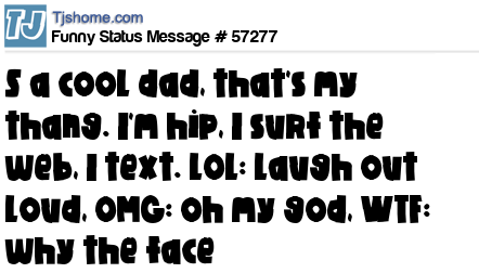 - # 28171 I'm a cool dad, that's my thang. I'm hip, I surf the web, I text. LOL: laugh out loud, OMG: oh my god, WTF: why the face
