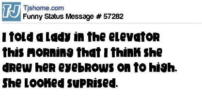 - # 67913 Told one of my favorite co-workers she drew her eyebrows on a little too high one morning a few years back. I've never forgotten how surprised she looked.