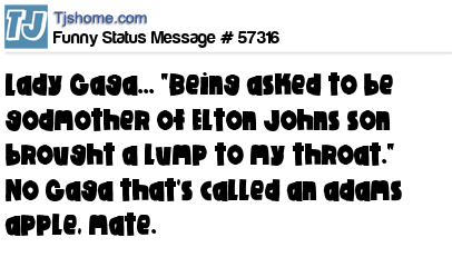 X  Lady Gaga... "Being asked to be godmother of Elton Johns son brought a lump to my throat."  No Gaga that's called an adams apple, mate.
