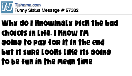 X Why do I knowingly pick the bad choices in life. I know I'm going to pay for it in the end but it sure looks like its going to be fun in the mean time